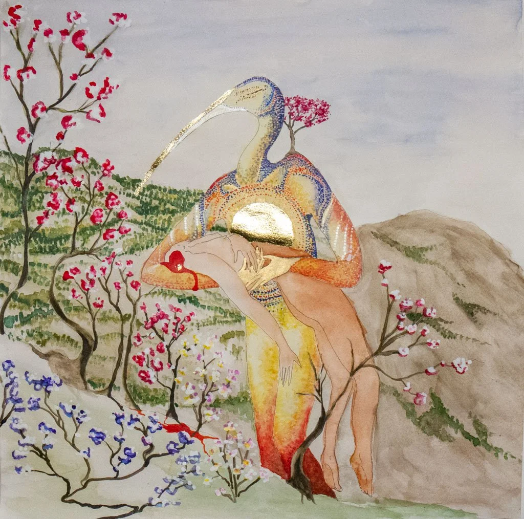 Her work investigates themes such as the transient and cyclical nature of life and death, psychological transformation, transmutation and metamorphosis, decay and birth, the never ending dance between harmony and chaos, the transformative function of rites of passage, and connection to otherness through vulnerability, loss, and care. Her practice is informed by her continued investigation into the psychological function of mythology and symbols, alchemy and esoteric texts, art therapy, ecology and system theory.